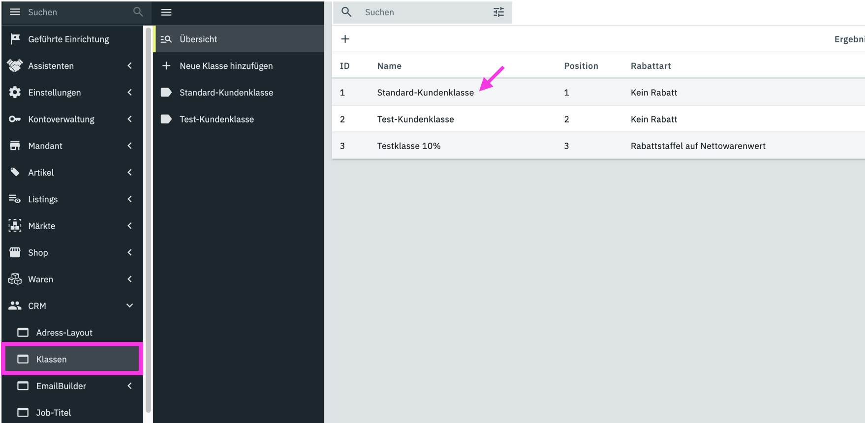 Öffne dafür das Menü Einrichtung » CRM » Klassen. Wähle anschließend die betroffene Klasse aus.