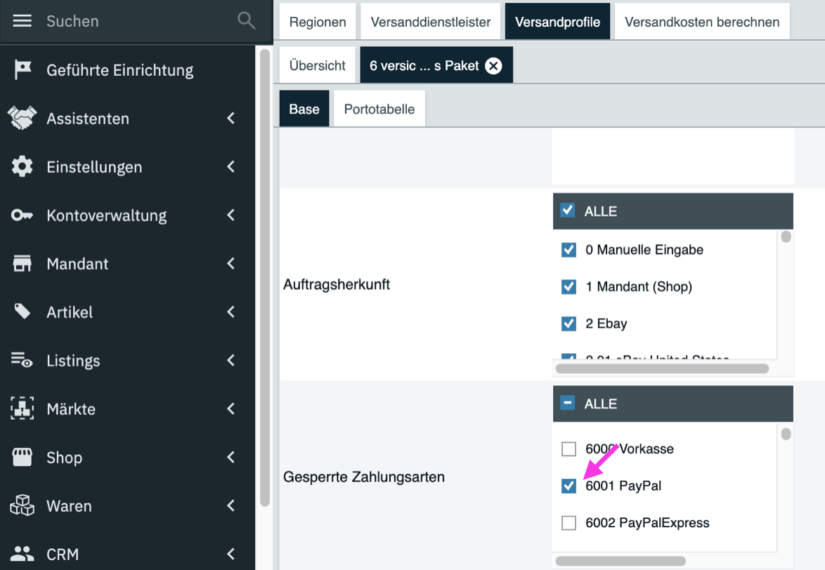 Zahlungsarten im Versandprofil überprüfen