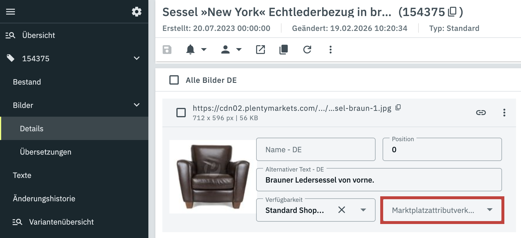 - Wechsle zurück in den Artikel. Du siehst nun für jedes Bild im Tab Bilder die Dropdown-Liste Marktplatzattributverknüpfung. Wähle hier einen Attributwert, mit dem das Bild verknüpft werden soll.