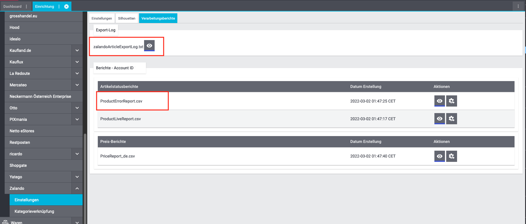 Einrichtung > Märkte > Zalando > Einstellungen > Tab: Verarbeitungsberichte