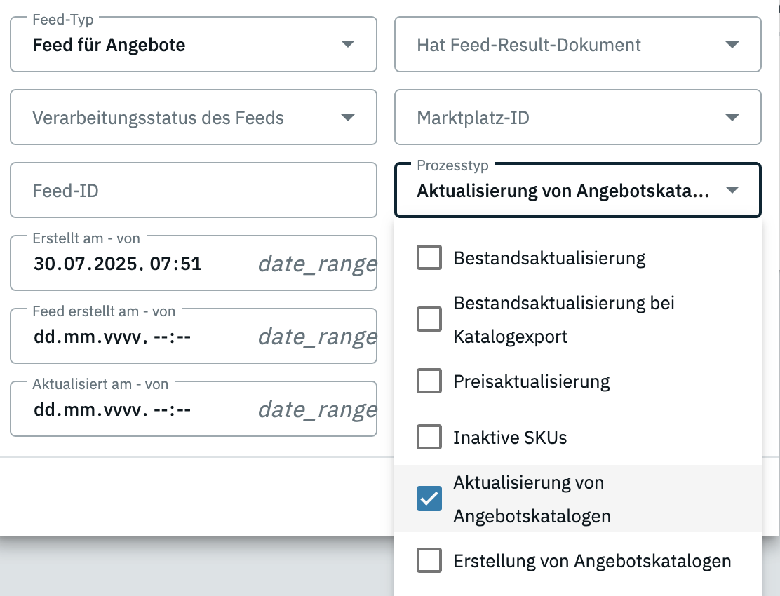 In der Feed-Übersicht im Menü Daten » Marktplätze » Amazon » Feeds kannst du gezielt nach den entsprechenden Feeds suchen: