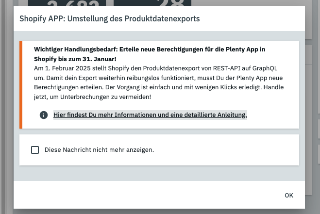 Aufgrund der anstehenden Umstellung der Shopify-Item-Schnittstelle von REST auf GraphQL muss Eure Plenty App innerhalb von Shopify aktualisiert werden, da hierzu eine weitere Berechtigung erforderlich wird. Hierzu benötigen wir Eure Mithilfe.