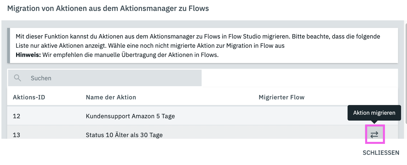 Wichtig: Der Flow ist nicht automatisch aktiv und muss aktiviert werden. Überprüfe den neu erstellten Flow sorgfältig, bevor du ihn aktivierst. Vergiss nicht, die migrierten Aktionen im Aktionsmanager zu deaktivieren, nachdem du den Flow erfolgreich konfiguriert hast.