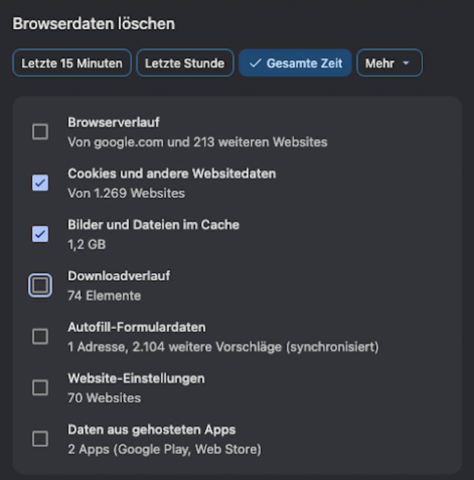 Lösche manuell den Browser-Cache und die Cookies in deinen Browser-Einstellungen: