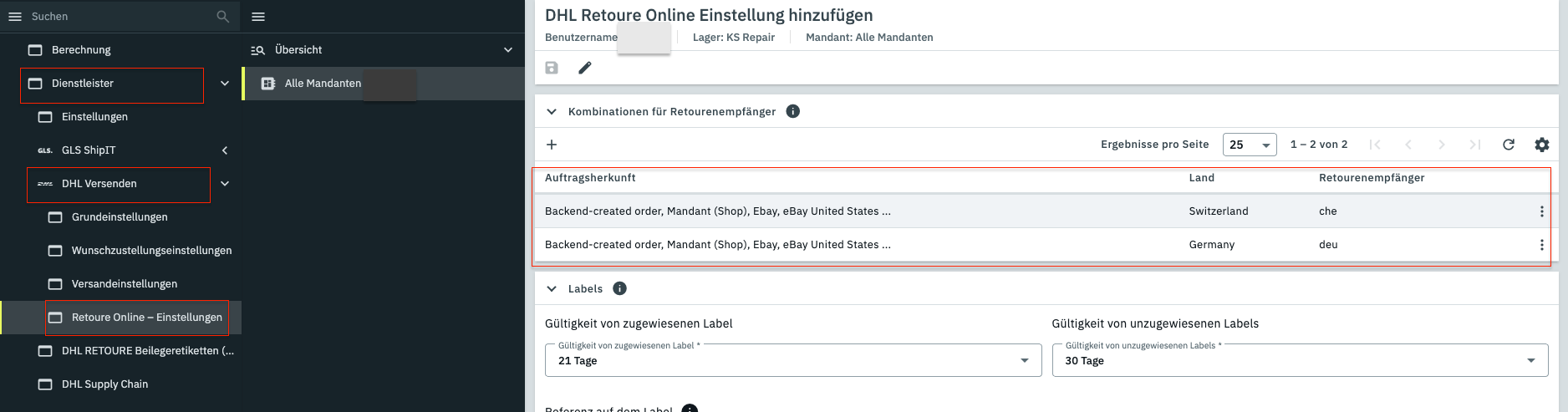 Einrichtung » Aufträge » Versand » Dienstleister » DHL Versenden » Retoure Online - Einstellungen.-