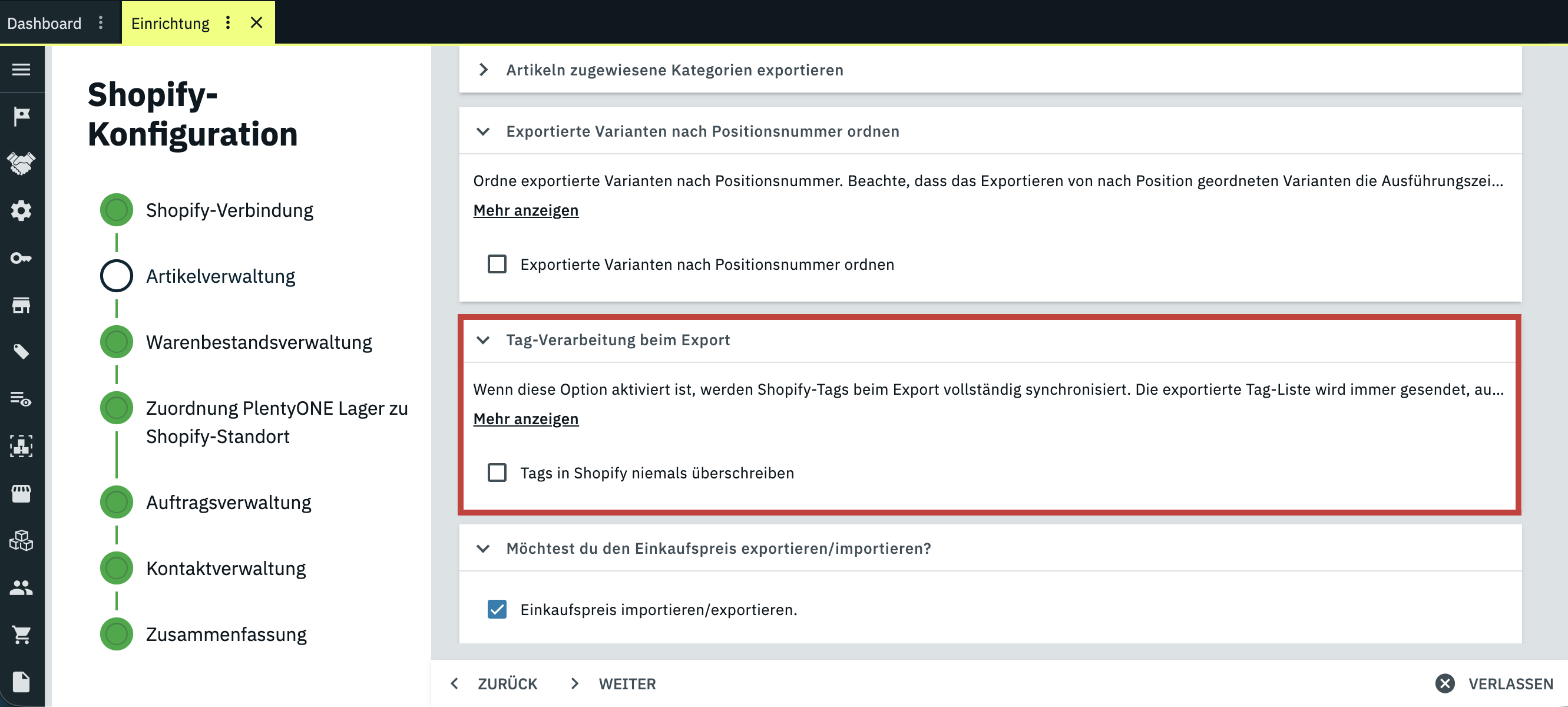 Im Assistenten Shopify-Konfiguration wurde im Schritt Artikelverwaltung die Option Tag-Verarbeitung beim Export entfernt.