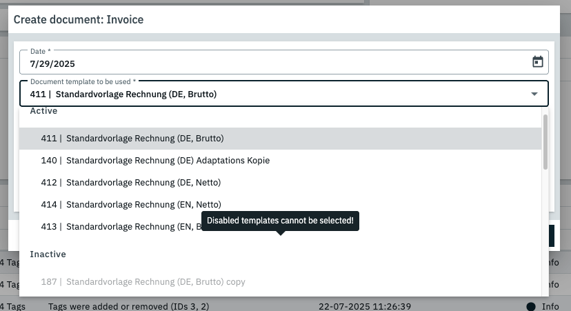 In the document widgets of the order UIs (regular orders, reorder, and redistribution), it is now possible to select the template to be used. If a matching template for a document type exists for the order, it will be selected immediately. If no suitable template is available, one of the listed active templates can be selected (inactive templates are also displayed, but cannot be selected).