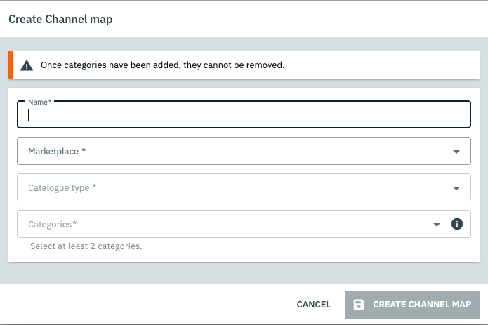 When creating a new Channel map in the Data » Catalogues » Tab: Channel maps menu, the Create Channel map window now includes the new Catalogue type field. Use this field to select the catalogue type for which you want to create a Channel map. You can currently select between the catalogue types Product for product catalogues and Offer for offer catalogues.