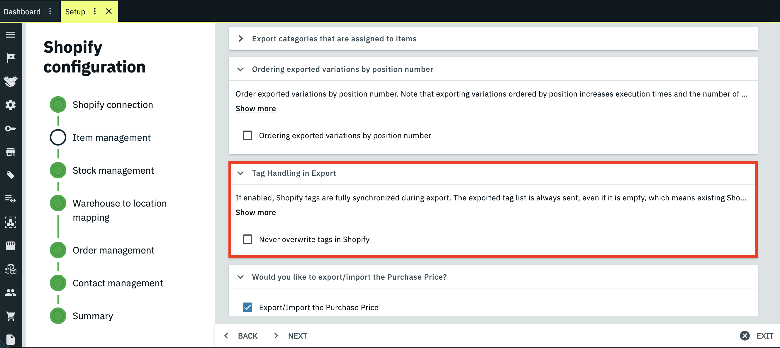 In the Shopify configuration assistant, the Tag Handling in Export option has been removed from the Item management step.